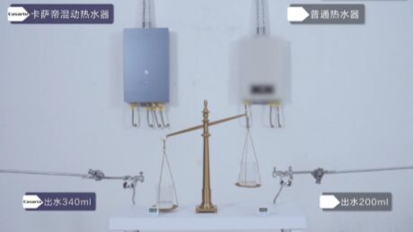 面對這類痛點(diǎn),什么樣的熱水器能夠解決呢?4月22日,卡薩帝官方平臺(tái)發(fā)布一段熱水器天平實(shí)驗(yàn)視頻。視頻顯示,卡薩帝「混動(dòng)」熱水器和普通熱水器在同時(shí)開啟10分鐘后,工作人員用兩個(gè)量杯分別接10s熱水放在天平上。可見,前者量杯中接出的水量多,天平朝前者傾斜。相同時(shí)間運(yùn)行的熱水器,為什么出水量不同?差別在于兩臺(tái)熱水器的科技不同。