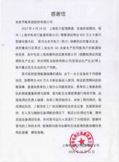 2022年4月,上海處于疫情肆虐,全城封鎖狀態(tài),華電閔行收到疫情能源保障的通知,急需兩臺2臺800萬大卡新設(shè)備投入使用,保證疫情期間的功能保障。華電聯(lián)系上海雙良服務(wù)分公司團隊說明情況后,服務(wù)公司立即組織響應(yīng),突破重重困難,辦理疫情通行特批手續(xù),奔赴現(xiàn)場,服務(wù)團隊負(fù)責(zé)人楊琪、自控師錢恒玉,本體工程師周杰組成調(diào)試隊伍,克服現(xiàn)場封閉,無輔助人員配合,吃住在會議室,迅速制定調(diào)試方案,順利完成設(shè)備調(diào)試,保障了疫情期間華電閔行順利完成疫情供能保障任務(wù)。