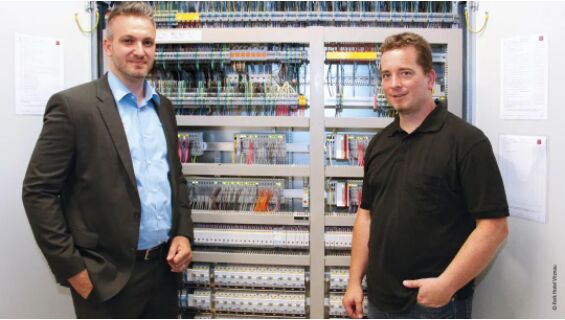 (從左到右)Panthek 公司項目經(jīng)理 Andreas Hutter 和 Beckhoff Automation 瑞士分公司銷售經(jīng)理 Daniel Rothenberger 在樓層分配器前