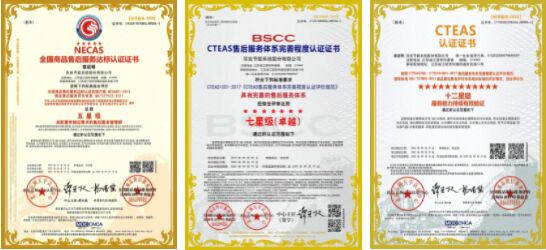 2016年,通過(guò)全國(guó)商品售后服務(wù)“五星級(jí)”認(rèn)證。2019年,通過(guò)“CTEAS售后服務(wù)體系完善七星級(jí)(卓越)”認(rèn)證。2022年,通過(guò)“十二星級(jí)服務(wù)能力持續(xù)有效驗(yàn)證”認(rèn)證。