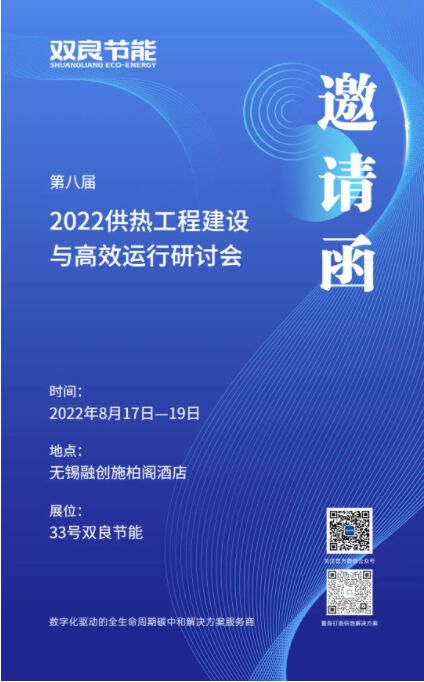 由中國市政工程華北設計研究總院有限公司、《煤氣與熱力》雜志社有限公司、中國建設科技集團股份有限公司主辦的“2022供熱工程建設與高效運行研討會(第八屆)”將于2022年8月17—19日(17日簽到)在江蘇省無錫市召開。歡迎您于8月18日、19日到雙良節(jié)能33號展位觀展。