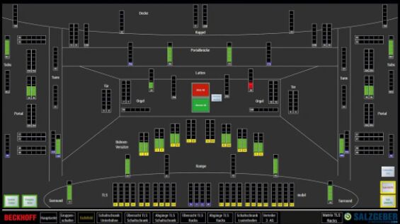 可視化元件基于 TwinCAT HMI 服務(wù)器(TF2000)實現(xiàn),并在一臺 C6515 控制柜式工業(yè) PC 上運行。用于顯示所有音頻設(shè)備狀態(tài)的 HMI 由一個 HMI 頁面上的大約 1000 個 PLC 變量組成,變量每 50 ms 更新一次,包括負(fù)責(zé)配電、狀態(tài)監(jiān)測和音頻信號的各種窗口!皩ξ覀儊碚f,可視化或視場的開發(fā)是最重要的方面之一,也是我們選擇與倍福合作的主要原因之一!盇thanasios Rovakis 表示。“現(xiàn)在我們可以使用顯示器追蹤聲音位置。如果您在調(diào)音臺工作,在距離揚(yáng)聲器較遠(yuǎn)的情況下播放音頻信號時,您會收到四處擴(kuò)散的噪聲,并且無法準(zhǔn)確地分辨噪聲來源。這時候,HMI 中揚(yáng)聲器音量表的 3D 排列就派上用場了!币纛l輸出可以通過控制室的物理按鍵、音頻控制臺以及 HMI 單獨靜音或全部靜音。在控制室中也會顯示功放的當(dāng)前工作狀態(tài)。LED 燈帶可以產(chǎn)生柔和、宜人的間接光。藍(lán)色表示揚(yáng)聲器處于靜音狀態(tài)。全自動控制室內(nèi)的環(huán)境照明變?yōu)榧t色或燈光被調(diào)暗是演出即將開始的信號,可以提醒操作人員提高注意力。