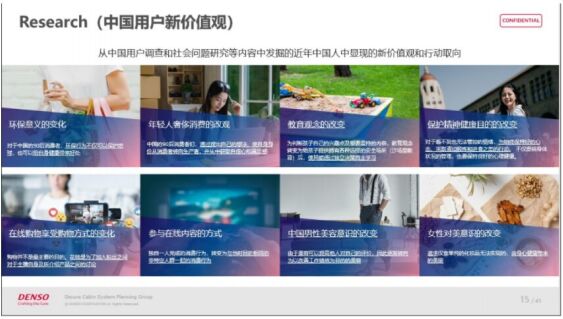 特別是年輕一代已經(jīng)成為車市的消費主力,其消費觀念與此前存在巨大差異。2022年上半年,電裝針對Z世代(1995-2009年出生)年輕人群開展了一次針對性的調(diào)研活動。通過問卷調(diào)調(diào)查、用戶訪談、專家訪談,以及對未來需求的共創(chuàng)討論發(fā)現(xiàn),中國年輕人對座艙的需求主要反映在以下幾個方面:第一,追求科技感的設(shè)計;第二,追求更多的車內(nèi)可自定義功能;第三,是對智能化的需求,希望車能主動感知人的狀態(tài),主動感知車內(nèi)車外的環(huán)境,然后主動提供各種功能跟服務(wù)。
