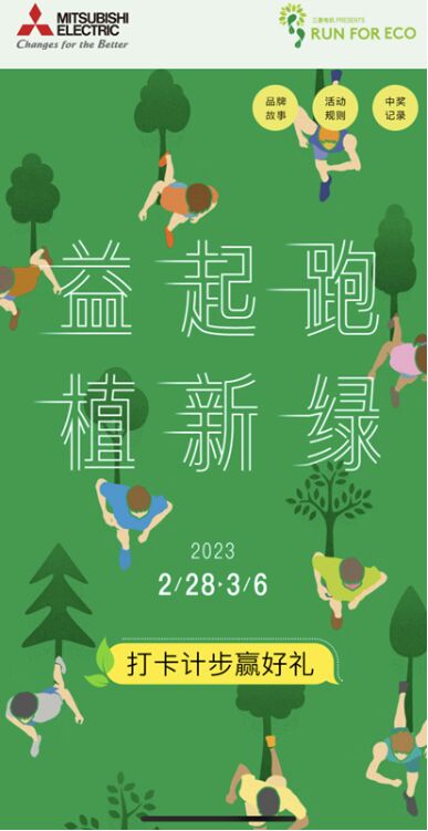 2023年2月28日至3月6日,三菱電機(中國)有限公司(以下簡稱“三菱電機”)再度攜手中華環(huán)境保護(hù)基金會,發(fā)起RUN FOR ECO“益起跑 植新綠”線上公益活動,該活動旨在為關(guān)心環(huán)境問題的社會各界人士提供社會貢獻(xiàn)的平臺,將環(huán)保與跑步運動巧妙地融合在一起,無論男女老少皆可輕松參與,通過打卡累計步數(shù)獲取的EcoPoint積分換算成相應(yīng)的善款,以支持中國環(huán)保事業(yè)。