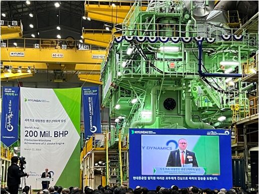 2023年3月22日,韓國現(xiàn)代重工發(fā)動(dòng)機(jī)與機(jī)械事業(yè)部(HHI-EMD)于韓國為全球最大的甲醇燃料二沖程發(fā)動(dòng)機(jī),即MAN B&W G95ME-LGIM型發(fā)動(dòng)機(jī),舉辦慶典儀式。該發(fā)動(dòng)機(jī)的制造也成功助力HHI-EMD累計(jì)生產(chǎn)的二沖程發(fā)動(dòng)機(jī)突破2億馬力里程碑。
