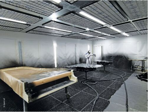 早在 30 年前就與貝森朵夫有過(guò)合作的 Berkmann Lackieranlagen 公司再次接受委托,建造新的車間!暗聡娖彳囬g的工藝流程基于全新的設(shè)計(jì)方案!变N售&技術(shù)總監(jiān) Rainer Berkmann 解釋道。內(nèi)部裝有通風(fēng)裝置、過(guò)濾系統(tǒng)以及熱回收和發(fā)電系統(tǒng)的設(shè)備控制中心,與工廠廠房分開安置在一棟建筑物內(nèi)。這樣就可以在噴漆作業(yè)區(qū)設(shè)立寬敞的工位,以及準(zhǔn)備工位和烘干室。油漆存放和準(zhǔn)備區(qū)也被整合到車間整體設(shè)計(jì)方案中。
