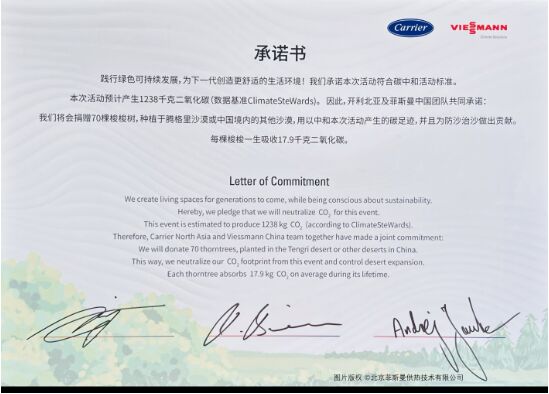 “本次活動(dòng)預(yù)計(jì)產(chǎn)生1238千克二氧化碳 (數(shù)據(jù)基準(zhǔn)ClimateSteWards)。 因此, 開(kāi)利北亞及菲斯曼中國(guó)團(tuán)隊(duì)共同承諾: