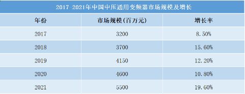 2021年作為“十四五”規(guī)劃的開局之年,雖然受能源雙控和環(huán)保高壓的影響,疊加汛情、疫情、臺風、限電等因素影響,下游投資有所減緩,但全年宏觀政策跨周期調(diào)節(jié)扎實推進,中國經(jīng)濟持續(xù)穩(wěn)定恢復,能源清潔低碳轉(zhuǎn)型深入推進,產(chǎn)業(yè)升級、結(jié)構(gòu)優(yōu)化持續(xù)發(fā)力,中高壓通用變頻器市場呈現(xiàn)高速增長。 2021年中國中高壓通用變頻器整體市場規(guī)模為 55億元,同比增長 19.6%。
