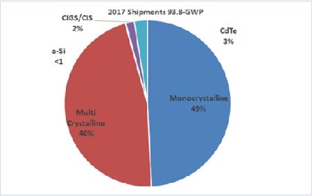 “單晶”份額上漲至49% 2017年,“單晶硅型”太陽能電池板出貨量首次超過“多晶硅”。美國太陽能發(fā)電市場調(diào)查咨詢公司spv在2017年12月發(fā)布的太陽能發(fā)電市場報告中得出了這一結(jié)論。 2000年初,夏普、京瓷、三菱電機等日本企業(yè)作為太陽能發(fā)電市場的領(lǐng)先企業(yè),當時的主流組件(面板)是多晶硅型。當時,單晶硅型雖然高效率,但價格低廉的“多晶硅型”在價格競爭中顯示出了優(yōu)勢。但是之后,“單結(jié)晶型”逐漸擴大了市場份額,最終奪走了冠軍寶座。 根據(jù)該報告,2017年太陽能電池(發(fā)電組件)的生產(chǎn)量為97.7GW,其中出貨量為93.8GW,其安裝容量為95.1GW。根據(jù)組件類型的占有率分析,在93.8GW的出貨量中,單結(jié)晶硅型的市場占有率為49%,多晶體硅型為46%,化合物型的鎘碲(CDTE)類型為3%(圖1)。