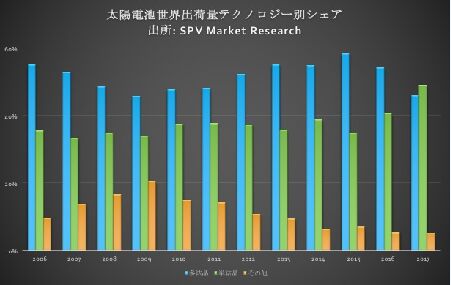 圖2太陽能電池板類型和世界光伏發(fā)電市場類型的市場份額趨勢(2006-2017年)(來源:SPV市場研究)