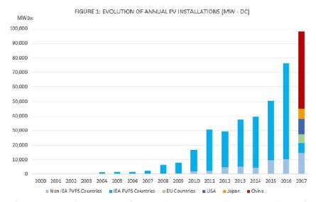 國際能源署的光伏發(fā)電系統(tǒng)項(xiàng)目(IEA PVPS)本周在其“全球光伏市場”報(bào)告中評估了全球太陽能市場。據(jù)此,全球光伏發(fā)電累計(jì)裝機(jī)容量在2017年底達(dá)到了402吉瓦,而去年新安裝的光伏發(fā)電量約為98吉瓦。 2016年,新增總計(jì)約為76吉瓦。 歐洲市場正在逐步復(fù)蘇,2017年增加6.5吉瓦,與2016年的6吉瓦相比略有增加。在歐洲,德國處于領(lǐng)先地位,新增裝機(jī)容量1.8吉瓦,其次是英國(950兆瓦),法國(875兆瓦)和荷蘭(853兆瓦)。去年土耳其增長2.6 GW,被IEA PVPS納入中東地區(qū)。 然而,鑒于全球市場的發(fā)展,增長仍然較低。報(bào)告的作者特別指出中國的快速發(fā)展,增加了53吉瓦,印度新增9.1吉瓦以及其他新興國家。因此,去年中國占全球市場一半以上。2011年以后,分布式光伏系統(tǒng)市場再次在全球范圍內(nèi)首次大幅增長,從2016年的19吉瓦累計(jì)容量增加到2017年的38吉瓦。但這里的主要增長來自中國。 不包括中國,去年全球光伏裝機(jī)容量僅增長4吉瓦至45吉瓦。根據(jù)國際能源署PVPS,中國以外的全球低增長率為全球光伏市場提供了一幅不同的情景。例如,美國市場下跌28%至10.6吉瓦,其他市場,如澳大利亞(1.25吉瓦),韓國(1.2吉瓦),巴基斯坦(800兆瓦),臺灣(523兆瓦)和泰國(251兆瓦),但馬來西亞,菲律賓,越南和印度尼西亞在未來幾年也有可能出現(xiàn)大幅增長。 盡管最近在中國大規(guī)模擴(kuò)張,但其潛力仍然巨大。畢竟,根據(jù)該報(bào)告,該國目前只覆蓋了3%的太陽能電力需求。排名中,洪都拉斯占13%以上,德國占7.5%,希臘占7.3%,意大利占7.11%。