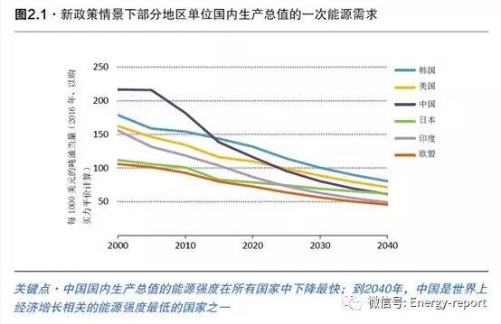 在新政策情景下,中國的能源需求增長速度下降到每年1%左右,不到該國自2000年以來的年平均水平的六分之一。這是經(jīng)濟結(jié)構(gòu)轉(zhuǎn)變、強勁能源效率政策實施和人口變化所帶來的綜合效應(yīng)。到2040年,能源需求總量的增長水平將與2008年至2016年這八年期間的增長水平基本持平。由于經(jīng)濟繼續(xù)快速增長,平均增長率為每年4.5%,相當于能源強度每年改善3.4%,據(jù)我們預測,這是截至2040年世界范圍內(nèi)最快的改善速度。到2040年,中國人均能源消費量也將增長四分之一,將在2035年左右超越歐盟。