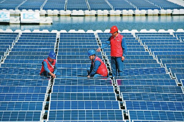 10月15日,總裝機容量為2兆瓦的水上漂浮式光伏發(fā)電站在安徽省天長市秦欄鎮(zhèn)牧馬湖建成并網(wǎng)發(fā)電。據(jù)了解,該項目克服水面漂浮電站施工中的技術(shù)難題,既不占用土地資源,又科學(xué)利用養(yǎng)殖水面,發(fā)展清潔能源,為當(dāng)?shù)剞r(nóng)民脫貧增收探索出一條新路。圖為電力員工巡視檢查發(fā)電設(shè)備。