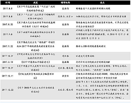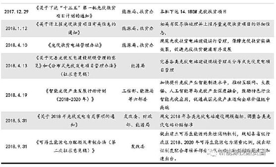 光伏制造各環(huán)節(jié)成本持續(xù)下降,平價(jià)上網(wǎng)即將來臨。2018H1,硅料、硅片、電池片、組件環(huán)節(jié)的制造成本(含稅)已降至65.00 元/kg、3.45 元/片、1.31 元/W、2.27 元/W,系統(tǒng)成本約5.4 元/W。補(bǔ)貼退坡倒逼光伏制造企業(yè)通過產(chǎn)能擴(kuò)張和技術(shù)進(jìn)步不斷降低生產(chǎn)成本,平價(jià)上網(wǎng)即將來臨。平價(jià)上網(wǎng)假設(shè)下,光伏各環(huán)節(jié)成本將進(jìn)一步下降,硅料、硅片、電池片、組件環(huán)節(jié)的制造成本(含稅)分別約為45.00元/kg、2.10元/片、0.77 元/W、1.56元/W,系統(tǒng)成本約3.29元/W。 531 政策短期沖擊明顯,有利于推動平價(jià)上網(wǎng)。2018年5月31日,三部委聯(lián)合發(fā)布《關(guān)于2018年光伏發(fā)電有關(guān)事項(xiàng)的通知》,政策影響主要體現(xiàn)在以下兩個(gè)方面:從短期來看,指標(biāo)限制導(dǎo)致我國2018 年光伏裝機(jī)需求下滑。根據(jù)政策安排,2018年暫不安排通光伏電站指標(biāo),安排10GW左右規(guī)模用于分布式光伏項(xiàng)目。從中長期來看,光伏補(bǔ)貼退有望推動平價(jià)上網(wǎng)加速實(shí)現(xiàn)。政策規(guī)定,自發(fā)文之日起,新投運(yùn)的光伏電站標(biāo)桿上網(wǎng)電價(jià)每千瓦時(shí)統(tǒng)一降低0.05元;新投運(yùn)的、采用“自發(fā)自用、余電上網(wǎng)”模式的分布式光伏發(fā)電項(xiàng)目,全電量度電補(bǔ)貼標(biāo)準(zhǔn)降低0.05元。光伏補(bǔ)貼退坡能夠推動企業(yè)通過技術(shù)進(jìn)步降低成本,光伏平價(jià)上網(wǎng)即將到來。 配額制即將落地,或?qū)⒅ζ絻r(jià)上網(wǎng)加速。2018年9月,發(fā)改委下發(fā)《可再生能源電力配額及考核辦法(第二次征求意見稿)》,提出建立可再生能源約束性消納機(jī)制,規(guī)劃各省級行政區(qū)2018、2020年可再生能源電力消費(fèi)比例,對保障小時(shí)數(shù)以內(nèi)的集中式風(fēng)電、光伏電量以及其他非水可再生能源發(fā)電量施行全額保障性收購(考慮技術(shù)等限制因素最多限電5%)。配額制若能落地,必將提高光伏電站年利用小時(shí)數(shù),進(jìn)一步降低度電成本,助力平價(jià)上網(wǎng)加速。近期光伏政策一覽表如下: