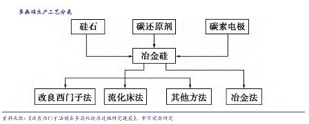 ③國(guó)內(nèi)多晶硅廠商成本優(yōu)于國(guó)外企業(yè),國(guó)產(chǎn)替代加速進(jìn)行 目前,我國(guó)多晶硅企業(yè)生產(chǎn)成本已大幅優(yōu)于國(guó)外企業(yè),德國(guó)瓦克、韓國(guó)OCI生產(chǎn)成本約為90~100元/kg;而通威股份2017年生產(chǎn)成本約56元/kg,預(yù)計(jì)樂(lè)山、包頭新產(chǎn)能現(xiàn)金成本30元/kg,生產(chǎn)成本40元/kg,全成本50元/kg。未來(lái)國(guó)內(nèi)低成本新產(chǎn)能將逐步替代韓國(guó)OCI、德國(guó)瓦克等國(guó)外產(chǎn)能。 ④技術(shù)路線確定,改良西門(mén)子法成本下行空間較大 改良西門(mén)子法是目前工業(yè)生產(chǎn)中廣泛采用的多晶硅制備方法,市場(chǎng)應(yīng)用占比超過(guò)90%。2017年投資成本約為14億元/萬(wàn)噸,預(yù)計(jì)到2020年投資成本有望下降至8~10億元/萬(wàn)噸,下降空間達(dá)28.6%。