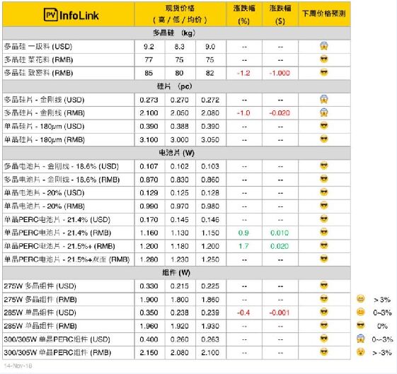 硅料價(jià)格 11月以來(lái)硅料價(jià)格基本持穩(wěn),雖然本周致密料價(jià)格些微下降,但主流價(jià)格與上周維持在差不多的水平。菜花料價(jià)格也維持在每公斤75-77元人民幣之間。 目前市場(chǎng)上買(mǎi)賣(mài)雙方對(duì)于成交價(jià)格還是較為保守,在此情況下,單晶硅片廠轉(zhuǎn)而想多用菜花料,而多晶硅片廠多用珊瑚料來(lái)降低原料成本。目前硅料的供需尚穩(wěn)定,預(yù)估國(guó)內(nèi)硅料的價(jià)格走勢(shì)在年底前都是較為平緩的態(tài)勢(shì)。海外部分則是高、低價(jià)持續(xù)往下,主流價(jià)格也仍是在每公斤9美元往下議價(jià)。 硅片價(jià)格 本周單、多晶硅片價(jià)格在硅料價(jià)格穩(wěn)定的情況下變動(dòng)不大。國(guó)內(nèi)多晶硅片的成交價(jià)微幅下修,但在硅料價(jià)格沒(méi)有繼續(xù)大幅降價(jià)的情況下,預(yù)估也即將落底。 目前整體多晶硅片的開(kāi)工率較為減少,在沒(méi)有過(guò)多的供應(yīng)下,11月底前主流價(jià)格應(yīng)能保持在每片2.05元人民幣上下。海外多晶硅片價(jià)格基本也保持在每片0.27元美金之上。 單晶硅片價(jià)格本周基本不變,但需求明顯轉(zhuǎn)好,盡管測(cè)算硅料成本,單晶硅片價(jià)格還有空間下修,但預(yù)計(jì)價(jià)格在12月調(diào)整的可能性較高。 電池片價(jià)格 多晶電池片隨著硅片價(jià)格逐漸落底、加上印度需求略有回升,短期內(nèi)價(jià)格較有支撐,本周價(jià)格維持在上周每瓦0.84-0.87元人民幣、0.103-0.107元美金的水平。 單晶方面,隨著應(yīng)用領(lǐng)跑者的持續(xù)搶裝,21.5%+的PERC電池片供應(yīng)將一路緊張至年底,由于市場(chǎng)上一片難求,單面21.5%+的PERC電池片本周價(jià)格再度上調(diào)0.02元人民幣,市場(chǎng)主流價(jià)格靠攏每瓦1.2元人民幣。雙面高效電池片本周則仍是高檔持穩(wěn)在每瓦1.25元人民幣。 在廠商陸續(xù)完成SE的調(diào)適之后,SE變?yōu)镻ERC電池片的標(biāo)準(zhǔn)配備,市場(chǎng)上轉(zhuǎn)換效率21.4%及以下的單晶PERC電池片供應(yīng)越來(lái)越少,逐漸變?yōu)榉侵髁鳟a(chǎn)品,本周維穩(wěn)在上周水平。 海外價(jià)格變化較大的部分在臺(tái)灣市場(chǎng),受到臺(tái)灣市場(chǎng)年底并網(wǎng)的小幅搶裝潮推動(dòng),臺(tái)灣各家單晶PERC電池片報(bào)價(jià)持續(xù)上揚(yáng),在上周靠攏每瓦0.165元美金之后,本周有廠商繼續(xù)挑戰(zhàn)每瓦0.17元美金,漲幅明顯。 組件價(jià)格 組件與電池片一樣呈現(xiàn)PERC產(chǎn)品供應(yīng)緊張的態(tài)勢(shì)。尤其領(lǐng)跑者所需的單面、雙面310W PERC組件一片難求,單面價(jià)格來(lái)到每瓦2.2元人民幣上下。300 / 305W 組件海內(nèi)外都有需求支撐、供應(yīng)也因?yàn)殡姵仄嵝Ф饾u減少,價(jià)格穩(wěn)定。
