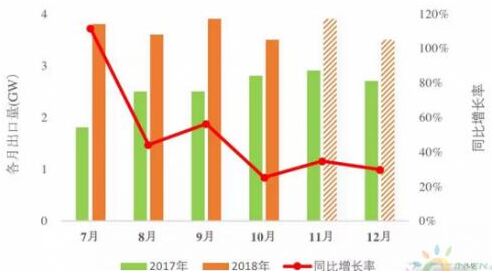 圖:2017、2018年下半年各月組件出口量及增長率