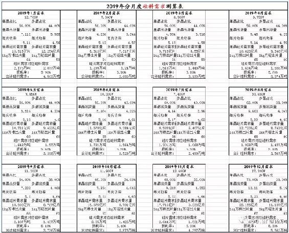 所以2019年全球光伏需求為93GW(海外)+37GW(國(guó)內(nèi))=130GW。這要比當(dāng)下最樂(lè)觀的研究機(jī)構(gòu)還要再樂(lè)觀10GW以上,而在我看來(lái)明年130GW可能還是起步,有一些專注開(kāi)拓海外市場(chǎng)的專家告訴我,明年海外增速有望繼續(xù)保持在40%以上的水準(zhǔn),畢竟2018年的增速都已經(jīng)達(dá)到了58%,2019年增速大于40%也是完全合理的。需求上的邊際變化將會(huì)顯著影響光伏產(chǎn)業(yè)供應(yīng)鏈各環(huán)節(jié)的價(jià)格。 二、在130GW需求假設(shè)下的供應(yīng)鏈各環(huán)節(jié)的供需分析 1、硅料環(huán)節(jié) 根據(jù)硅料供需測(cè)算模型,在130GW的需求假設(shè)下以及在合理的但多晶占比的假設(shè)下,2019年硅料需求量為44.3萬(wàn)噸,測(cè)算模型如下: