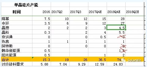 上面這張截圖是2017年年底總結(jié)的,現(xiàn)在回顧他發(fā)現(xiàn)基本不用修改,因?yàn)闆](méi)有新增的進(jìn)入者,反倒是有幾家公司并沒(méi)有如期達(dá)產(chǎn);京運(yùn)通原本計(jì)劃中的3GW產(chǎn)能現(xiàn)在也沒(méi)有蹤影;阿特斯之前拋出了雄心勃勃的計(jì)劃,但實(shí)際上目前只有24臺(tái)單晶爐做中試線;韓華新能源也同樣,并沒(méi)有有效產(chǎn)能出來(lái),依然需要通過(guò)外部采購(gòu)。當(dāng)前市場(chǎng)中有效的單晶硅片產(chǎn)能實(shí)際上只有四家但是由于晶科、晶澳只自用不外供,所以對(duì)于市場(chǎng)上第三方公開(kāi)對(duì)外銷售的產(chǎn)能,有效供給只有兩家:隆基和中環(huán),在硅片環(huán)節(jié),迅速地形成了雙寡頭壟斷的產(chǎn)業(yè)格局。這是供給端,我們?cè)倏纯磫尉Ч杵男枨蠖耍?nbsp;