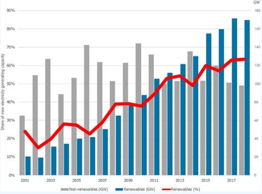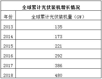 根據(jù)國際可再生能源機構(IRENA)最新數(shù)據(jù),2018年全球新增并網(wǎng)光伏裝機量94.3GW,2018年全球所有可再生能源新增裝機量171GW,太陽能新增裝機量占可再生能源裝機量的一半以上,累計光伏裝機容量占全球可再生能源的1/3左右。 光伏發(fā)電從2013年的135GW,逐步增長到2017年的386GW,再飛躍到2018年的480GW,短短5年時間,實現(xiàn)了3.5倍的增長。其中,亞洲、美國及少數(shù)歐洲國家和南美、中東地區(qū)等新興國家成為了支撐去年光伏新增裝機量亮眼數(shù)據(jù)的主力。