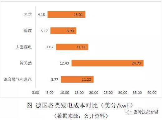 德國(guó)電廠每千瓦時(shí)純天然氣發(fā)電量的平均成本仍然很高,每千瓦時(shí)在0.1103~0.2194歐元之間,褐煤每千瓦時(shí)為0.0459~0.079歐元,大型燃煤電廠每千瓦時(shí)為0.0627~0.0986歐元,混合燃?xì)夂驼羝l(fā)電廠每千瓦時(shí)為0.0778~0.0996歐元。在光照條件好的地區(qū),德國(guó)光伏發(fā)電成本已經(jīng)成為最低的發(fā)電類型,而且也基本與其他發(fā)電端成本相差不大。