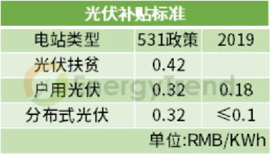 競價配置項目 上網(wǎng)指導電價:Ⅰ類地區(qū)0.4元/千瓦時、Ⅱ類地區(qū)0.45元/千瓦時、Ⅲ類地區(qū)0.55元/千瓦時。 集中式 531政策后,由于暫不安排2018年普通光伏電站建設規(guī)模,以及2019年度光伏政策未下發(fā)的不確定下,目前一季度光伏裝機容量為2.4GW。 2019年度的集中式光伏電站上網(wǎng)電價通過市場競爭方式確定,將三類資源區(qū)集中式電站標桿上網(wǎng)電價改為指導價,不得超過所在資源區(qū)指導價。 工商業(yè)分布式 2019年7月開始,工商業(yè)分布式光伏項目一律通過競價方式進行指標配置,無論是“自發(fā)自用,余量上網(wǎng)”的還是“全額上網(wǎng)”的項目,市場競爭形成的價格既不得超過指導價。 其中“自發(fā)自用,余電上網(wǎng)”的項目按全電量0.1元補貼,補貼標準也不得超過每千瓦時0.1元。 已明確規(guī)模項目 戶用光伏 2018年531政策中,能源局明確了分布式規(guī)模10GW,但在今年戶用單獨配置的情況下,根據(jù)2019年一季度分布式光伏總量2.8GW,按財政部30億的補貼中,戶用7.5億配置來看,戶用光伏在0.18元的高補貼,擬定3.5GW的裝機規(guī)模下,還是極具吸引力的。 光伏扶貧 由于光伏扶貧項目不在財政部下發(fā)的30億元補貼的大盤子中,按單獨補貼計算,剩下的22.5億元光伏補貼將流入競價配置項目中。 而早些時候發(fā)布的“十三五”第二批光伏扶貧電站中提到,本次下達的光伏扶貧項目原則上應在2019年底前全容量建成并網(wǎng),“十三五”第一批光伏扶貧項目須在2019年6月30日(含)前全容量建成并網(wǎng)。未按期建成并網(wǎng)的項目視為自動放棄,不再納入國家光伏扶貧目錄。 結合國家能源局第二批光伏扶貧電站下達的1.67GW裝機規(guī)模,加上2017年公布第一批扶貧電站4.2GW的裝機規(guī)模中未并網(wǎng)的項目,在上網(wǎng)電價仍維持每千瓦時0.65元、0.75元、0.85元執(zhí)行的情況下,光伏扶貧項目需求動能已全面開啟。