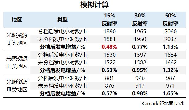 在模擬計(jì)算中,雙面組件疊加雙面雙測(cè)雙分檔技術(shù)在一類地區(qū)可較背面未分檔組件增發(fā)0.48-1.13%;二類地區(qū)增發(fā)0.53-1.32%;三類地區(qū)增發(fā)0.57-1.65%。在日照二三類地區(qū),分檔增發(fā)比例更明顯。