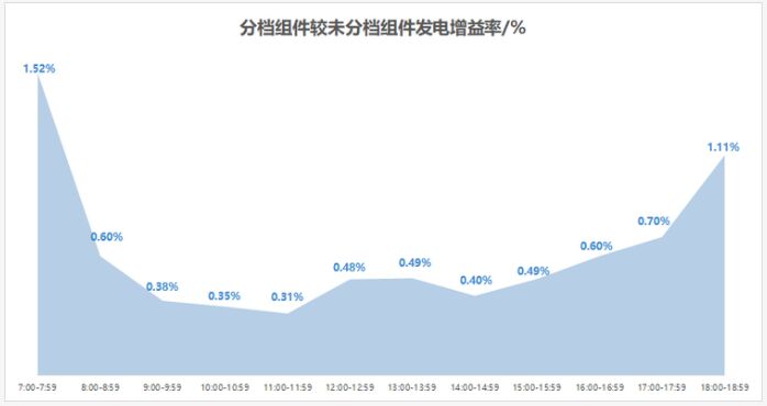 依照青海共和(Ⅰ類光照資源)實(shí)證數(shù)據(jù),背面分檔組件較背面未分檔組件發(fā)電增益約0.49%,與模擬測(cè)算結(jié)果的0.48%基本無(wú)異。下面是青海共和(Ⅰ類光照資源地區(qū))電站的實(shí)測(cè)發(fā)電數(shù)據(jù): 對(duì)比五月背面分檔組件與背面未分檔組件的發(fā)電量,可以發(fā)現(xiàn)分檔的發(fā)電增益隨著光照強(qiáng)度變動(dòng)呈現(xiàn)規(guī)律的變化,發(fā)電高峰的每小時(shí)月度增益總和超過(guò)100kWh。 觀察每小時(shí)段背面分檔組件較背面未分檔組件的發(fā)電增益率,一天內(nèi),光照條件好的中午,分檔增益在0.3%-0.5%,在光照條件較弱的早晨和晚上,分檔增益更高,接近2%。