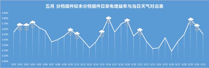 將分檔組件的日發(fā)電增益與當(dāng)?shù)靥鞖鉅顩r組合觀察發(fā)現(xiàn),陰雨天背面分檔組件發(fā)電增益率更明顯。