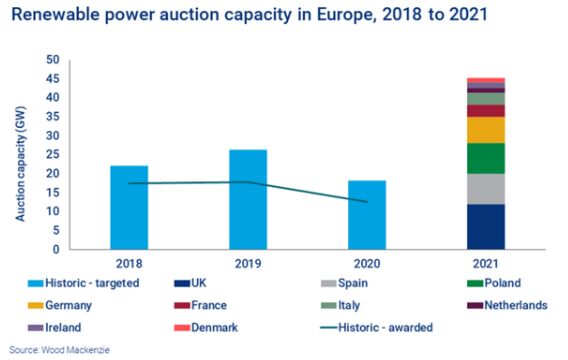在經(jīng)歷了動(dòng)蕩的2020年之后,歐洲電力市場(chǎng)有望迎來較為樂觀的2021年。在新的一年里,歐洲各國的政策制定者和市場(chǎng)參與者將在歐美綠色協(xié)議的指引下,向著零凈排放的目標(biāo)有效推動(dòng)實(shí)質(zhì)性的進(jìn)程。預(yù)計(jì)2021年歐洲可再生能源競(jìng)標(biāo)將創(chuàng)下新的記錄。 根據(jù)Wood Mackenzie最新的一項(xiàng)分析,2021年歐洲計(jì)劃競(jìng)標(biāo)的總?cè)萘扛哌_(dá)45GW,其中包括17GW的風(fēng)電,6GW的光伏發(fā)電,以及技術(shù)中立的或多種可再生能源混合技術(shù)。 以往的競(jìng)拍結(jié)果表明,中標(biāo)總量可能低于目標(biāo)值。在過去的三年里,歐洲競(jìng)標(biāo)的平均成交率為70%,也就是說,2021年極有可能最終落地30GW的發(fā)電容量。