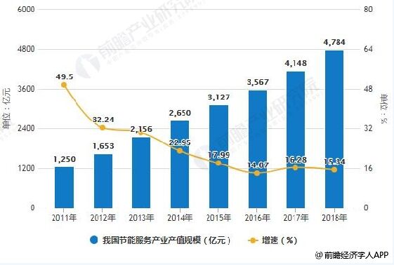 2011-2018年我國(guó)節(jié)能服務(wù)產(chǎn)業(yè)產(chǎn)值規(guī)模統(tǒng)計(jì)及增長(zhǎng)情況預(yù)測(cè)