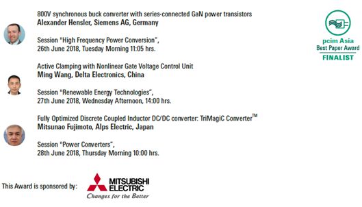 PCIM Asia 2018 國際研討會(huì)獎(jiǎng)項(xiàng)入圍名單 研討會(huì)每年設(shè)立“最佳論文獎(jiǎng)”和“青年工程師獎(jiǎng)”兩大獎(jiǎng)項(xiàng),以表彰在電力電子行業(yè)的技術(shù)研究、市場趨勢預(yù)測及政策倡議上都有卓越貢獻(xiàn)之杰出人士。 最佳論文獎(jiǎng)
