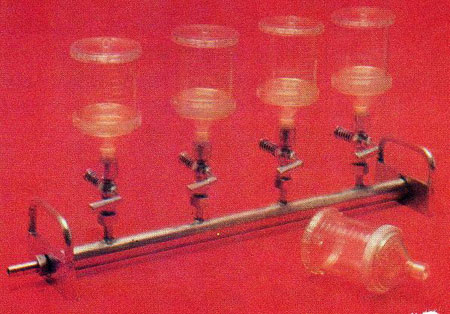 無(wú)菌檢查薄膜濾器本儀器按照中國(guó)藥典2005年版之無(wú)菌檢查法實(shí)驗(yàn)要求,參加國(guó)際通用標(biāo)準(zhǔn)設(shè)計(jì)而成,適用于除菌過(guò)濾,菌落檢查及液體中微 粒的測(cè)定。 (一)儀器特點(diǎn): ①省去抽濾瓶、重量輕、體積小,適宜于凈化臺(tái)內(nèi)操作。 ②濾器呈半透明狀,便于觀察,定量控制。 ③濾器備有底座,可配套更換,適合于常規(guī)試驗(yàn)。 ④每個(gè)濾器設(shè)有閥門,可單獨(dú)使用。 ⑤耐壓、耐溫,可在121℃30分鐘熱壓消毒。 (二)產(chǎn)品規(guī)格: ①濾器內(nèi)徑50mm ②有效容積:100ml ③重量:60g(單只) ④材質(zhì)為聚碳酸酯,密度圈為硅橡膠 ⑤備有四頭不銹鋼底座 (三)注意事項(xiàng): ①使用前,必須對(duì)過(guò)濾器進(jìn)行潔凈處理,所選濾膜應(yīng)浸泡過(guò)夜。 ②消毒時(shí)將濕態(tài)膜貼在支撐板上,蓋上密封墊圈,將貯液杯和支座螺紋稍旋緊,待消毒后在旋緊,以紗布包裹進(jìn)行熱壓消 毒,以免微孔濾膜破裂。 ③器蓋上有孔,可套針頭過(guò)濾器用以過(guò)濾外界空氣,以免污染。 ④本品不耐酸、堿及其他化學(xué)品。 (四)適應(yīng)范圍: ①醫(yī)藥工業(yè)藥品檢驗(yàn):注射 用抗生素及其他可溶性藥品的無(wú)菌檢查。 ②引水、飲料及食品的菌落檢查。 ③醫(yī)院的醫(yī)學(xué)臨床檢驗(yàn):體液的細(xì)菌及微生物測(cè)定。 ④科研、教學(xué)領(lǐng)域的除菌過(guò)濾或檢查細(xì)菌用。 ⑤用于微孔濾膜的質(zhì)量檢查。