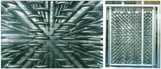 一般蓄冰槽在盤(pán)管內(nèi)側(cè)循環(huán)鹵水,盤(pán)管外儲(chǔ)水結(jié)冰于管壁,由于靜止蓄冰與鹵水熱交換為傳導(dǎo)熱傳模式,因此儲(chǔ)冰效率不佳。在溶冰初期,鹵水管與結(jié)冰間管壁冰迅速溶冰成水后逐漸形成鹵水與冰間的靜止水層,成為熱阻抗而使溶冰效率減緩,甚至在溶冰末期雖有剩余冰量,卻無(wú)法使用的現(xiàn)象。