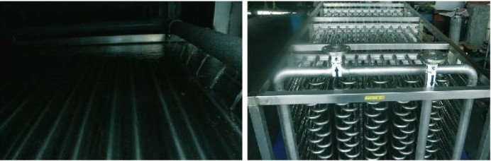 動(dòng)態(tài)蓄冰槽是基于對(duì)流熱傳優(yōu)于傳導(dǎo)熱傳原理,將盤(pán)管間以隔板隔成數(shù)空間室,再配以一小型循環(huán)水泵將水導(dǎo)流而上下循環(huán)于各隔板間室,或利用泵將蓄冰槽內(nèi)水從底部抽出,從頂部撒水,如此可以利用最小的動(dòng)力泵(每槽約1~2HP )構(gòu)成一動(dòng)態(tài)冰水循環(huán)水流,儲(chǔ)冰時(shí)管內(nèi)鹵水與管外冰水間形成對(duì)流傳熱,從而提高結(jié)冰均勻度。在溶冰過(guò)程由于循環(huán)水流攪動(dòng)使鹵水與冰水間的靜止水曾流動(dòng)起來(lái),可有效提高換熱效率,對(duì)于溶冰效果具相當(dāng)助益,降低殘冰量,少量剩余殘冰也會(huì)浮到水面而不會(huì)卡在盤(pán)管之間,防止盤(pán)管過(guò)度凍結(jié)而,使儲(chǔ)冰槽儲(chǔ)冷容量完全發(fā)揮。以上為動(dòng)態(tài)儲(chǔ)冰槽基本原理,亦為其優(yōu)異之特點(diǎn)。