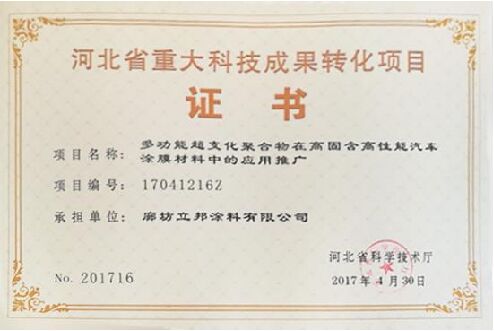 目前,工程技術(shù)研究中心承擔(dān)了六項重點研究項目,河北省科技廳和廊坊市科技局將共同為項目研究提供110萬元的專項建設(shè)資金。項目的主要研究領(lǐng)域涉及水性涂料與汽車涂料,重點研究方向則聚焦于高性能、環(huán)保性和便捷的應(yīng)用性板塊。項目完成后,預(yù)計銷售額可以新增3800萬元。此外,車用高固體份罩光清漆是該工程技術(shù)研究中心正在研發(fā)的產(chǎn)品。對此,河北省科技廳也為之提供了150萬元的重大科技成果專項資金支持。這不僅是對立邦技術(shù)研發(fā)的肯定,更為立邦與產(chǎn)業(yè)鏈伙伴的合作奠定了基礎(chǔ)。值得一提的是,立邦后續(xù)依次還申報了四項河北省節(jié)能環(huán)保技術(shù)成果和河北省工信廳A級研發(fā)平臺項目。6月,廊坊立邦涂料有限公司申報的“多功能超支化聚合物在高固含高性能汽車涂膜材料中的應(yīng)用推廣”項目,開發(fā)出了施工VOC含量低于420g/L的高固含高性能汽車清漆涂料,成功申報為河北省重大科技成果轉(zhuǎn)化項目。工程技術(shù)研究中心的負(fù)責(zé)人表示:“隨著工程技術(shù)研究中心建設(shè)的不斷完善,技術(shù)人才的持續(xù)培養(yǎng)和引進(jìn),今后將會有更多優(yōu)秀的專項申報。”