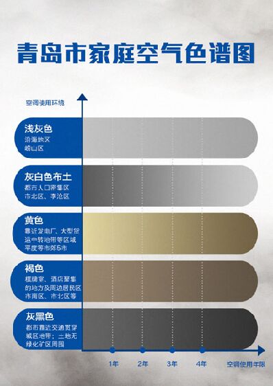 4月15日,海爾自清潔空調(diào)對(duì)外公布了一份“青島市家庭空氣色譜圖”。這是自2015年12月24日起至今,海爾“集塵行動(dòng)”走進(jìn)青島七區(qū)五市對(duì)1838個(gè)家庭抽樣進(jìn)行空調(diào)免費(fèi)清洗過(guò)程中采集到的灰塵標(biāo)本而制成。從這張“空氣色譜圖”來(lái)看,青島七區(qū)五市家庭采集到的灰塵基本呈現(xiàn)五種顏色:淺灰、灰白、灰黑、黃色、褐色。