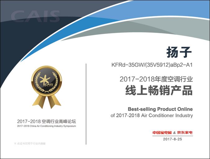 2017年8月25日,主題為“天氣論VS進(jìn)化論”的2017-2018中國(guó)空調(diào)行業(yè)高峰論壇在京召開(kāi)。會(huì)議對(duì)2017冷年以及2018冷年空調(diào)行業(yè)進(jìn)行了盤點(diǎn)與趨勢(shì)分析,并對(duì)表現(xiàn)突出的品牌及產(chǎn)品進(jìn)行了集中表彰。其中,揚(yáng)子空調(diào)成功獲得“2017-2018中國(guó)空調(diào)行業(yè)節(jié)能標(biāo)桿品牌”,旗下明星產(chǎn)品KFRd-35GW/(35V5912)aBp2-A1、KFRd-52LW/(5211916)aBp2-A1則分別贏得“2017-2018中國(guó)空調(diào)行業(yè)線上暢銷產(chǎn)品”,“2017-2018中國(guó)空調(diào)行業(yè)創(chuàng)新設(shè)計(jì)產(chǎn)品”的殊榮。