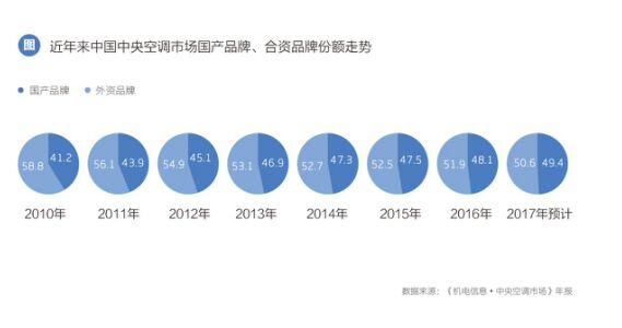 8月下旬,國內(nèi)家電企業(yè)上市公司中期報(bào)告集中發(fā)布,幾大巨頭業(yè)績看點(diǎn)頗多。國產(chǎn)幾大家電企業(yè)無論是營業(yè)收入還是凈利潤都呈現(xiàn)大幅增長態(tài)勢。 緊跟其后“中國企業(yè)500強(qiáng)”榜單發(fā)布再次聚焦市場眼球。以海爾、美的、格力領(lǐng)銜的八家家電企業(yè)營收總規(guī)模突破8700億元。海爾以2016.08億元領(lǐng)跑,美的以1598.41億元排名101位緊隨其后。 幾大家電巨頭靚麗成績單的背后,空調(diào)產(chǎn)品扮演著極為重要的角色,特別是過去的一年,空調(diào)產(chǎn)業(yè)整體上升趨勢明顯,而其中中央空調(diào)作為近年來備受矚目的細(xì)分單元,盈利能力和市場增長速度都有大幅提升。 國內(nèi)幾大行業(yè)媒體發(fā)布的2017年上半年中央空調(diào)市場報(bào)告顯示,2017年上半年中國中央空調(diào)市場整體增幅超過25%,半年容量首次突破400億元關(guān)口,市場信心空前高漲。 其中值得關(guān)注的是,以格力、海爾、美的為代表的國產(chǎn)品牌占比份額再次提升。公開的數(shù)據(jù)顯示,2010年國產(chǎn)品牌中央空調(diào)占比41.2%,而到2016年年底,這個(gè)數(shù)字變成了48.1%,進(jìn)展勢頭不似家用空調(diào)當(dāng)年開疆拓土?xí)r摧枯拉朽,但筆者認(rèn)為改變的力量已經(jīng)形成并積聚。隨著 “國進(jìn)外退”的整體趨勢推導(dǎo),國家對(duì)綠色節(jié)能技術(shù)扶持力度持續(xù)加大,國產(chǎn)品牌超越外資成為市場主角的趨勢已然客觀存在。國內(nèi)幾大中央空調(diào)市場研究機(jī)構(gòu)一致預(yù)測,國產(chǎn)品牌市場占比將會(huì)在2018年全面超越外資品牌。
