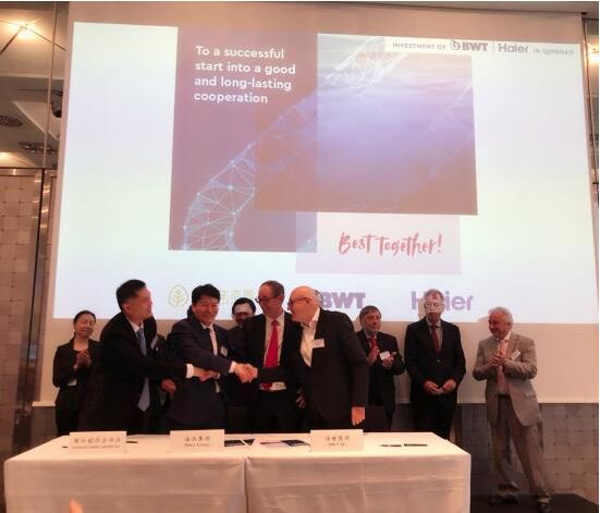 6月6日,海爾集團(tuán)與BWT集團(tuán)在德國(guó)簽訂戰(zhàn)略合作協(xié)議,雙方整合各自在凈水技術(shù)研發(fā)、大規(guī)模定制、觸點(diǎn)網(wǎng)絡(luò)等領(lǐng)域的優(yōu)勢(shì),以資本合作為紐帶,強(qiáng)強(qiáng)聯(lián)合,共建全球一流水生態(tài),為中國(guó)用戶定制高端凈水解決方案。據(jù)悉,雙方合資成立的制造工廠將落戶青島西海岸新區(qū)中德生態(tài)產(chǎn)業(yè)園。 中國(guó)駐杜塞爾多夫總領(lǐng)事馮海陽、青島市委常委、市委秘書長(zhǎng)祝華、杜賽爾多夫副市長(zhǎng)Wolfgang Scheffler、BWT集團(tuán)CEO Andreas Weissenbacher、海爾集團(tuán)副總裁解居志等出席了此次簽約儀式。杜塞爾多夫工商會(huì)榮譽(yù)主席、德國(guó)電信監(jiān)事會(huì)主席李寧雅,杜塞爾多夫市副市長(zhǎng)謝福剛,北威州經(jīng)濟(jì)部國(guó)際事務(wù)局局長(zhǎng)凱爾克曼,德國(guó)亞太經(jīng)濟(jì)委員會(huì)首任主席、西門子前董事長(zhǎng)兼CEO馮必樂,BWT集團(tuán)董事長(zhǎng)Weissenbacher Andreas先后致辭,并見證雙方簽約。