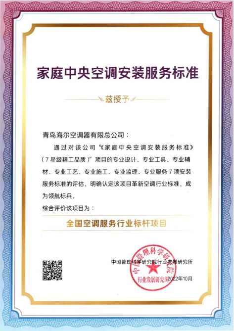 11月29日,海爾中央空調(diào)聯(lián)合中國管理科學(xué)研究院行業(yè)發(fā)展研究所,發(fā)布了家庭中央空調(diào)行業(yè)首個(gè)安裝服務(wù)標(biāo)準(zhǔn)。同時(shí),該標(biāo)準(zhǔn)對(duì)海爾中央空調(diào)“7星級(jí)精工品質(zhì)”做出評(píng)估,涉及專業(yè)工具、專業(yè)輔材、專業(yè)工藝、專業(yè)施工、專業(yè)監(jiān)理、專業(yè)服務(wù)等,認(rèn)定其為“全國空調(diào)服務(wù)行業(yè)標(biāo)桿項(xiàng)目”,革新空調(diào)行業(yè)標(biāo)準(zhǔn),成為領(lǐng)航標(biāo)兵。
