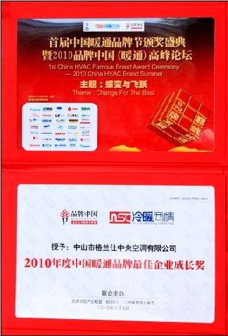 ——斬獲“最佳企業(yè)成長(zhǎng)獎(jiǎng)” 執(zhí)行總裁梁昭賢被授予“2010年度中國(guó)暖通界十大功勛企業(yè)家”榮譽(yù)稱(chēng)號(hào) 2010年8月9日,由品牌中國(guó)產(chǎn)業(yè)聯(lián)盟和《冷暖商情》雜志聯(lián)合主辦的“2010首屆品牌中國(guó)(暖通)高峰論壇暨頒獎(jiǎng)典禮”在京隆重舉行。建設(shè)部政策研究中心主任陳淮、品牌中國(guó)產(chǎn)業(yè)聯(lián)盟主席艾豐、品牌中國(guó)產(chǎn)業(yè)聯(lián)盟副秘書(shū)長(zhǎng)張呂清等行業(yè)領(lǐng)頭人,格蘭仕、大金、海爾、美的、格力等國(guó)內(nèi)外著名中央空調(diào)廠家以及多家媒體代表等上百人出席了此次盛會(huì)。 本屆品牌節(jié)旨在尋求未來(lái)中國(guó)暖通業(yè)的發(fā)展方向,為行業(yè)發(fā)展搭建交流對(duì)話(huà)平臺(tái),共議行業(yè)發(fā)展的熱點(diǎn)難點(diǎn)問(wèn)題,研討企業(yè)調(diào)整結(jié)構(gòu)轉(zhuǎn)型升級(jí)之路,同時(shí)表彰那些具有卓越經(jīng)營(yíng)業(yè)績(jī)和非凡發(fā)展特質(zhì)的優(yōu)秀品牌,樹(shù)立和推動(dòng)行業(yè)標(biāo)桿企業(yè)、優(yōu)秀方案及產(chǎn)品、成功應(yīng)用典范,全面展示中國(guó)暖通業(yè)的成果和輝煌。格蘭仕中央空調(diào)因令人矚目的發(fā)展速度和卓越的經(jīng)營(yíng)業(yè)績(jī)斬獲“2010年度中國(guó)暖品品牌最佳企業(yè)成長(zhǎng)獎(jiǎng)”,同時(shí)格蘭仕集團(tuán)總裁梁昭賢也被授予“2010年度中國(guó)暖通界十大功勛企業(yè)家”榮譽(yù)稱(chēng)號(hào)。