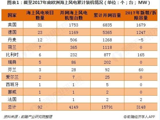 歐洲海上風(fēng)電發(fā)展現(xiàn)狀 隨著歐盟提出到2020年可再生能源占?xì)W盟總能源消費的20%,歐洲海上風(fēng)電呈現(xiàn)快速發(fā)展趨勢,已成為當(dāng)前全球最大的海上風(fēng)電行業(yè)市場。2017年,歐洲海上風(fēng)電新增裝機容量為3148MW,占全球海上風(fēng)電新增裝機容量72.6%,海上風(fēng)電累計裝機容量為15780MW,占全球海上風(fēng)電累計裝機容量83.9%。 其中,英國是全球海上風(fēng)電的第一大國,擁有海上風(fēng)電項目31個,并網(wǎng)海上風(fēng)電機組臺數(shù)1753臺,2017年新增裝機容量1679MW,累計并網(wǎng)容量達(dá)6835MW。德國自2012年以后逐漸成為世界上重要的風(fēng)電工程市場,其政府組織也明確提出必須在國內(nèi)開展新能源轉(zhuǎn)型工作,加大力度發(fā)展海上風(fēng)電行業(yè)。截至2017年,德國擁有海上風(fēng)電項目23個,并網(wǎng)海上風(fēng)電機組臺數(shù)1169臺,累計并網(wǎng)容量5355MW。