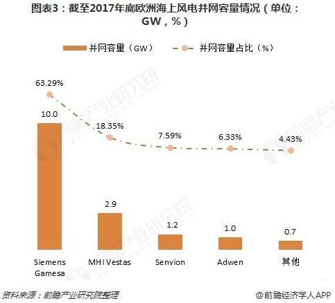 并網(wǎng)容量方面,截至2017年底,在歐洲累計并網(wǎng)的海上風(fēng)電機組中,Siemens Gamesa占據(jù)了最大的份額,占并網(wǎng)容量63.29%,占并網(wǎng)臺數(shù)63.80%,其次是MHIVestas占并網(wǎng)容量18.35%,占并網(wǎng)臺數(shù)22.13%。