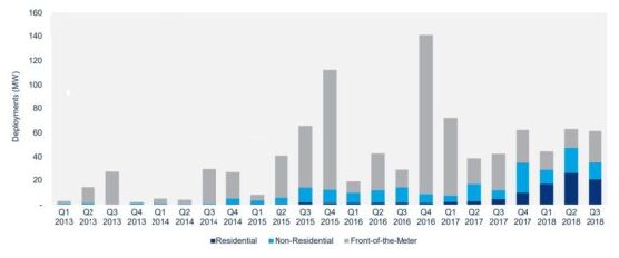 根據(jù)本周公布的最新美國能源存儲監(jiān)測報告,美國能源儲能項目在2018年翻了一番,達到32.9千兆瓦(GW)。 Wood Mackenzie Power&Renewables和能源存儲協(xié)會(ESA)上周四發(fā)布了美國儲能監(jiān)測報告,顯示美國第三季度儲能部署同比增長44%。具體而言,美國第三季度總共部署了61.3兆瓦(MW),同比增長198%。