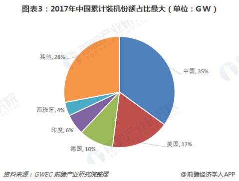 近年來我國風(fēng)電行業(yè)高速發(fā)展與國家政策的支持是密切相關(guān)的,曾出臺(tái)一系列補(bǔ)貼及促進(jìn)平價(jià)上網(wǎng)措施等。在全球各國風(fēng)電累計(jì)裝機(jī)份額中,中國在全球風(fēng)電市場中占比最大,2017年累計(jì)裝機(jī)市場份額達(dá)35%,高于其他國家。在全球風(fēng)電行業(yè)市場份額格局中,我國已成“主戰(zhàn)場”。