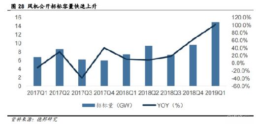 2019開年以來,各種題材輪換不止,但是,亦有許多板塊正在“悶聲發(fā)大財(cái)”。這不,到開春時(shí)節(jié),風(fēng)電行業(yè)亦是“聞風(fēng)而動”,從低谷走出。 風(fēng)電一季度回暖 據(jù)行業(yè)統(tǒng)計(jì),2019年1-3月,全國新增風(fēng)電裝機(jī)容量478萬千瓦,其中海上風(fēng)電12萬千瓦,累計(jì)并網(wǎng)裝機(jī)容量達(dá)到1.89億千瓦。2019年1-3月,全國風(fēng)電發(fā)電量1041億千瓦時(shí),同比增長6.3%;全國平均風(fēng)電利用小時(shí)數(shù)556小時(shí),同比下降37小時(shí)。一季度,全國棄風(fēng)電量43億千瓦時(shí),同比減少48億千瓦時(shí);全國平均棄風(fēng)率4.0%,棄風(fēng)率同比下降4.5個百分點(diǎn)。全國棄風(fēng)電量和棄風(fēng)率持續(xù)“雙降”。 國內(nèi)風(fēng)電公開招標(biāo)容量亦在快速上升。據(jù)金風(fēng)科技的統(tǒng)計(jì),2019年以來,國內(nèi)公開招標(biāo)量已達(dá)到14.9GW,同比增長101%,創(chuàng)單季最高招標(biāo)量歷史紀(jì)錄。其中,海上風(fēng)電招標(biāo)3.0GW,同比增長61.2%,占比20.3%。分區(qū)域看,南方市場招標(biāo)3.7GW,占比25.0%,北方項(xiàng)目11.1GW,占比74.3%,集中采購招標(biāo)量0.1GW,占比0.7%。