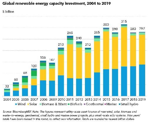 彭博社新能源財(cái)經(jīng)(BNEF)近日發(fā)布的年度數(shù)據(jù)顯示,2019年全球?qū)稍偕茉串a(chǎn)能的投資為2822億美元,較2018年的2802億美元增長(zhǎng)1%,全球最大的市場(chǎng)(中國(guó))有所回落,但其第二大市場(chǎng)(美國(guó))創(chuàng)下了新紀(jì)錄。