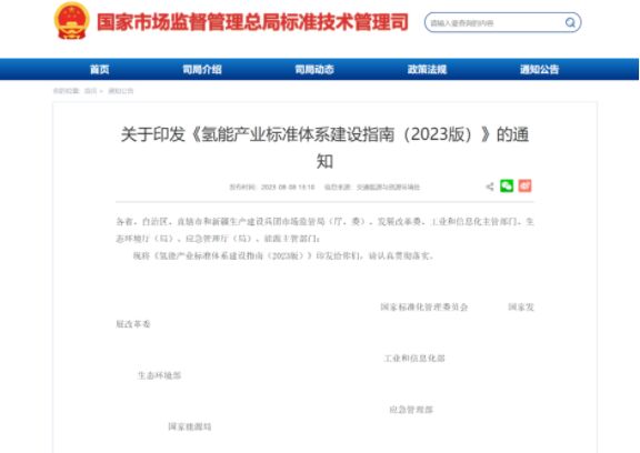 8月8日,國家標準化管理委員會、國家發(fā)展和改革委員會、工業(yè)和信息化部等六部門聯(lián)合印發(fā)《氫能產業(yè)標準體系建設指南(2023版)》,這是國家層面首個氫能全產業(yè)鏈標準體系建設指南。