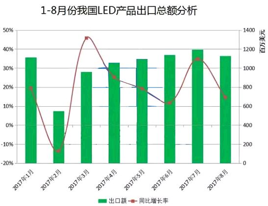 在過去的幾個月,LED市場持續(xù)火熱,金磚會議等國際事件增加了國際貿易合作與活動,對LED產品的出口有促進作用。本期文章將總結1-8月份LED產品出口情況。 一、出口總額突破80億 據材料深一度統(tǒng)計,2017年1-8月,我國LED照明產品的出口總額達82億美元。其中,7月份的出口額是接近12億美元,同比增長34.84%,環(huán)比增長4.89%;8月份的出口額超過11億美元,同比增長14.68%,環(huán)比下降5.68%,由下圖可以看出,3月份到7月份的出口額增速緩慢,而8月份較7月份的出口額小幅回落。